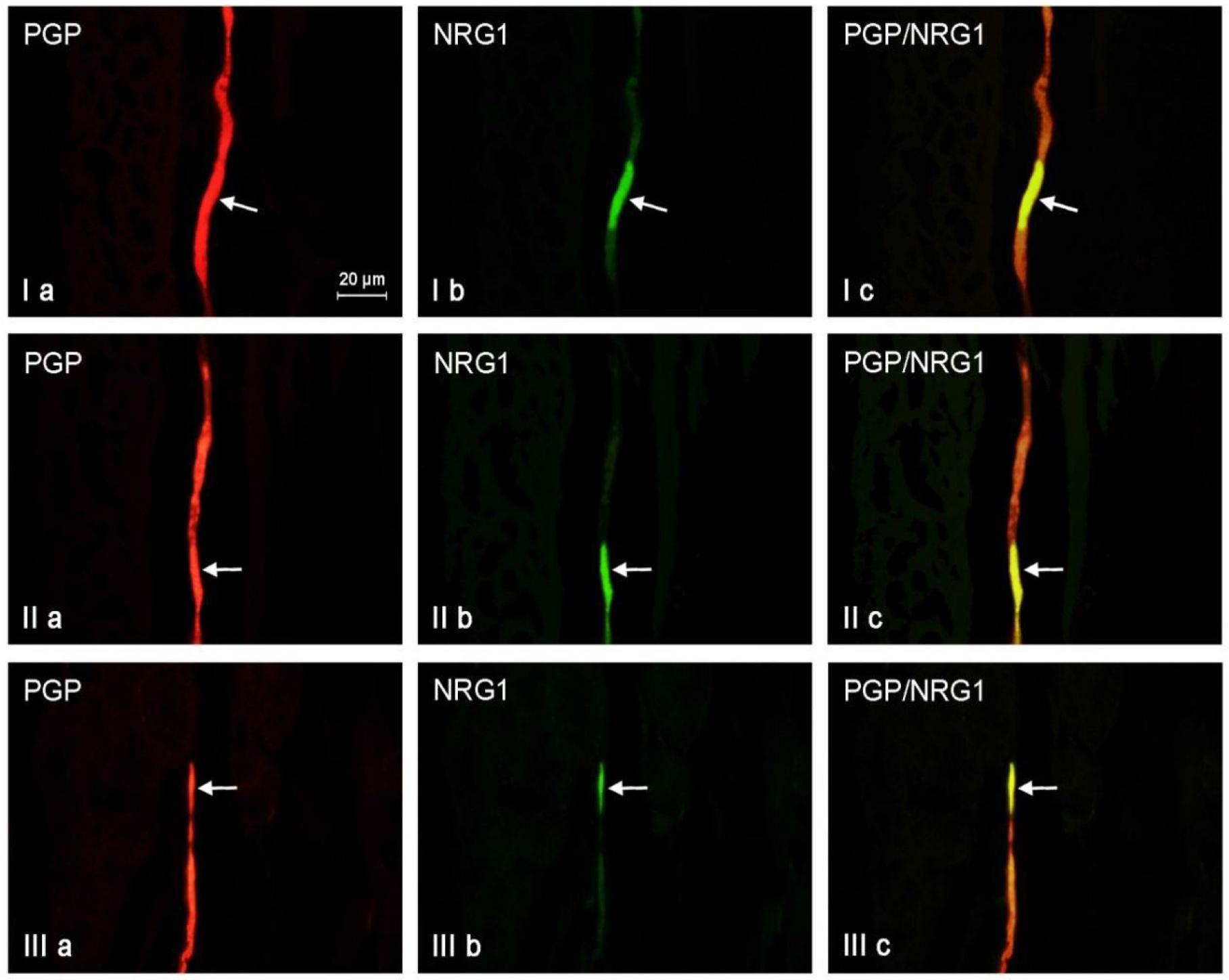 Example micrographs of neuregulin 1 (NRG 1)-positive neurons in the duodenal myenteric plexus (I), jejunal outer submucous plexus (II) and ileal inner submucous plexus (III). Arrows – neurons immunoreactive to both the anti–protein gene product (PGP) 9.5 and anti-NRG 1 antibodies; scale bar – 20 μm