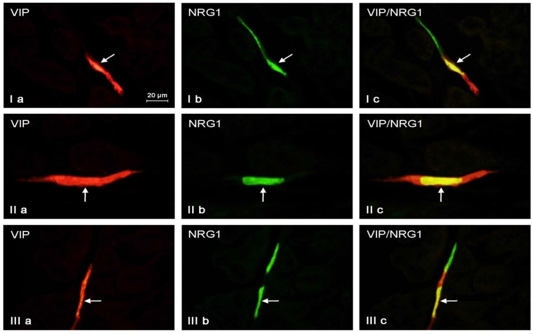 Example micrographs of the colocalisation of vasoactive intestinal polypeptide (VIP) and neuregulin 1 (NRG 1) in neurons located in the duodenal outer submucous plexus (I), jejunal inner submucous plexus (II) and ileal myenteric plexus (III). Arrows – neurons immunoreactive to both the anti-VIP and anti-NRG1 antibodies; scale bar – 20 μm
