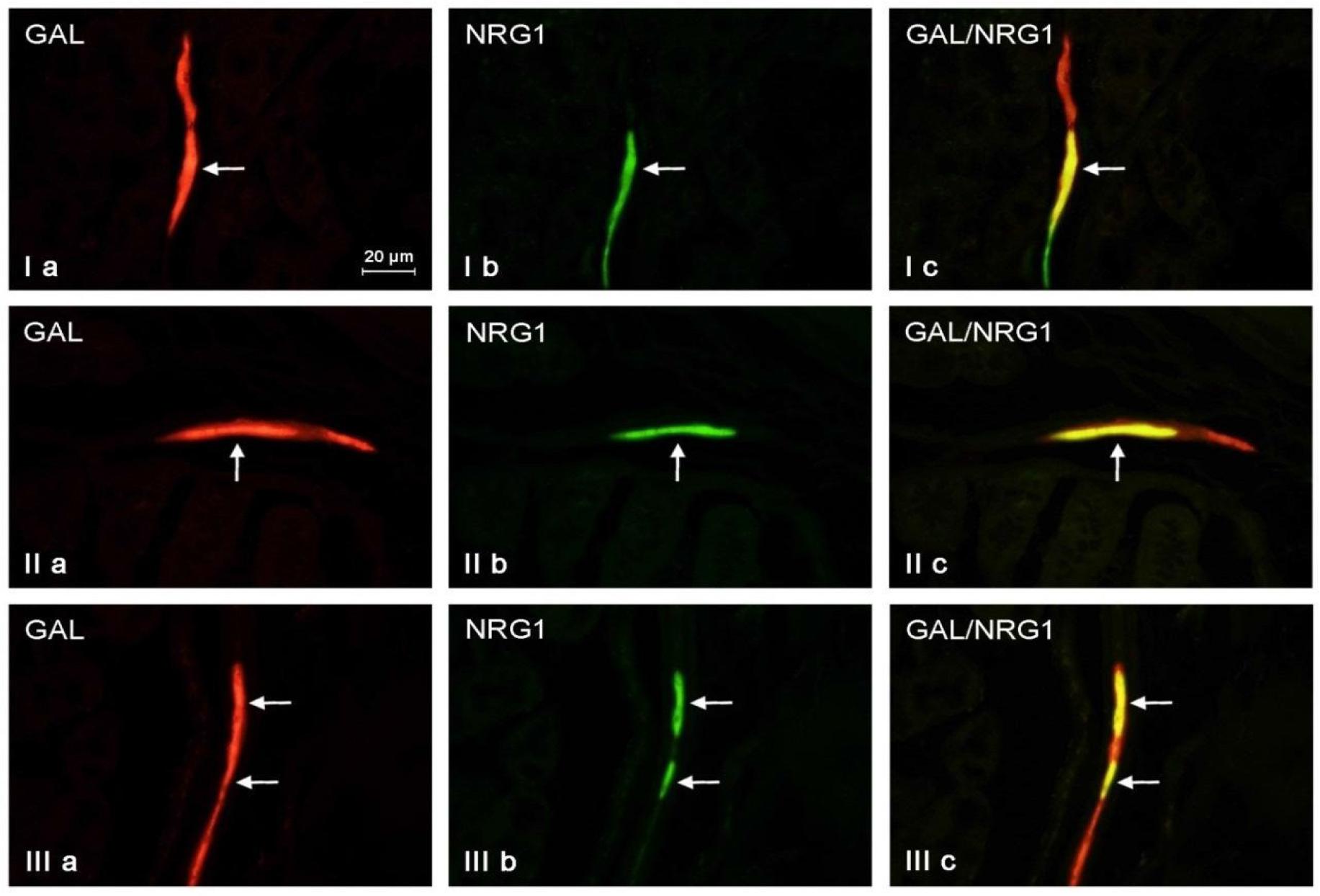 Example micrographs of the colocalisation of galanin (GAL) and neuregulin 1 (NRG 1) in neurons located in the duodenal myenteric plexus (I), jejunal inner submucous plexus (II) and ileal outer submucous plexus (III). Arrows – neurons immunoreactive to both the anti-GAL and anti-NRG1 antibodies; scale bar – 20 μm