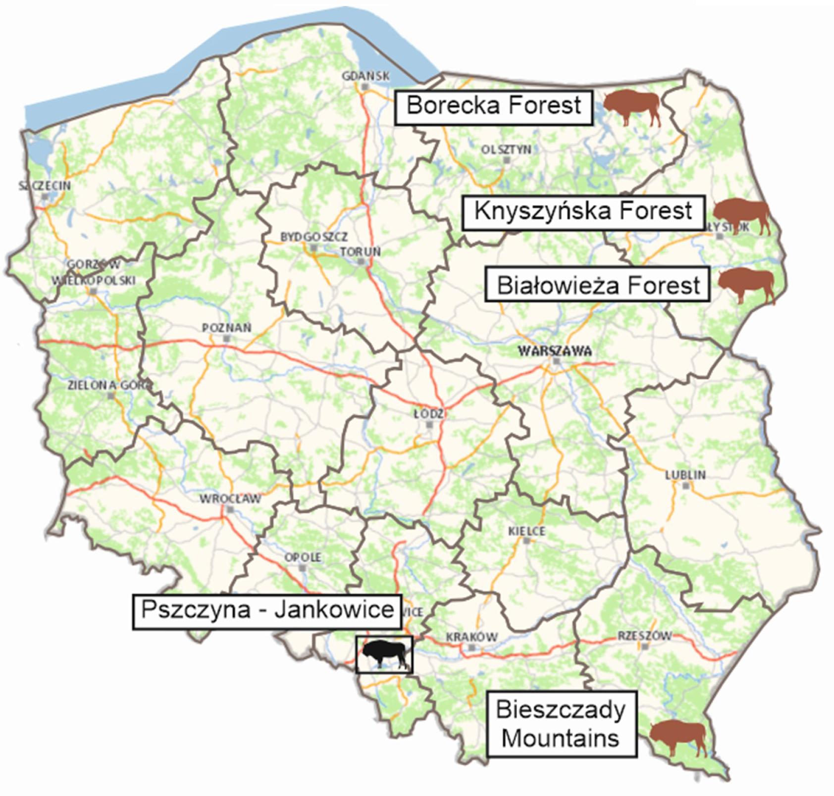The research was conducted in Poland as a part of the “Complex project of European bison conservation by State Forests”. Between 2020 and 2024, serum samples were collected from 119 free-ranging European bison comprising 44 females and 75 males. The animals had habitats in the Bieszczady Mountains (n = 70) or the lowland Pszczyna-Jankowice, Knyszyńska Forest, Borecka Forest or Białowieża Forest areas (n = 49) (Fig. 1). The animals ranged in age from 1 to 23 years.