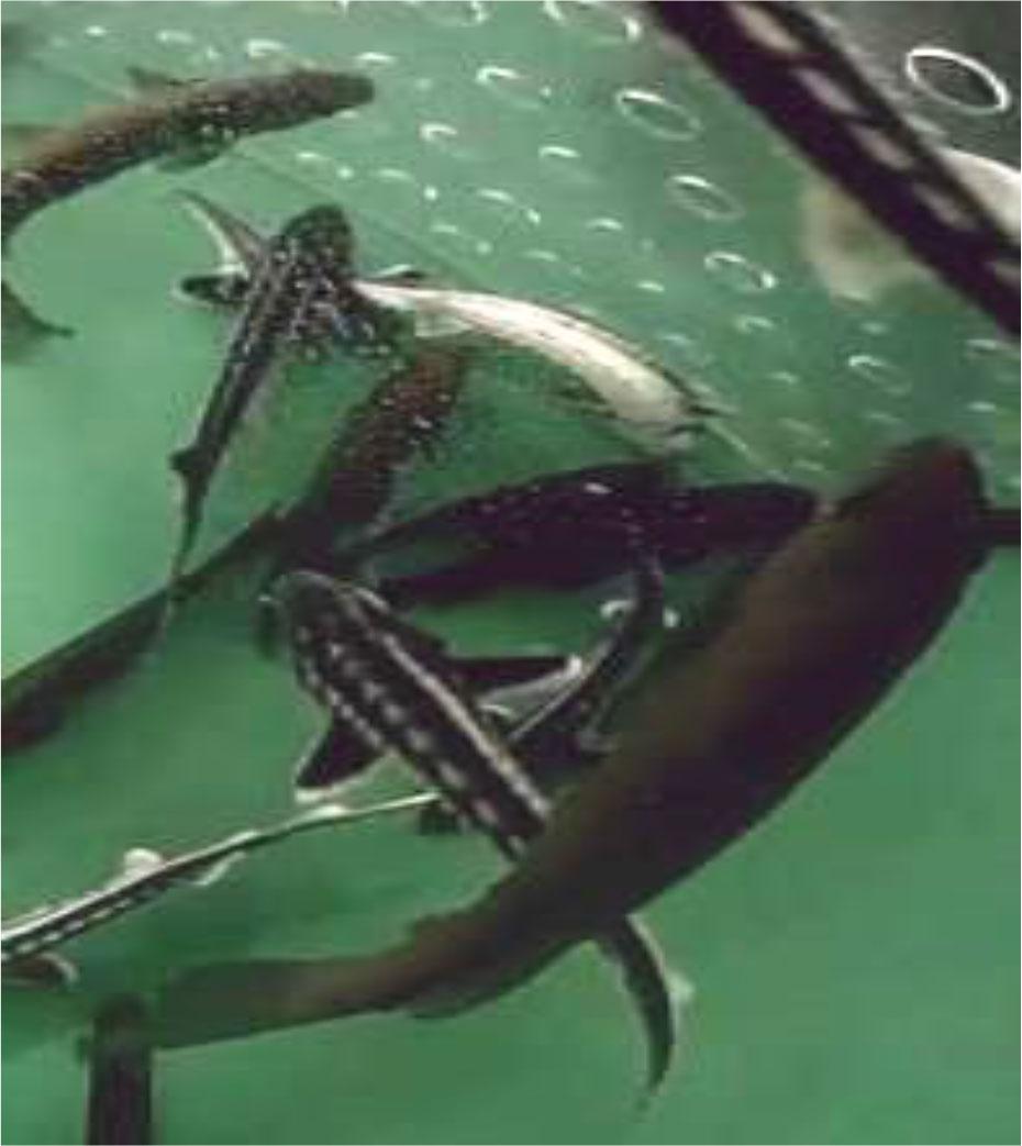Dead sturgeon lying on the bottom of the tank with bent bodies