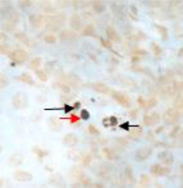 AciHV-like signals in kidney tissues. Red arrow – positive signals; black arrows – melanomacrophages