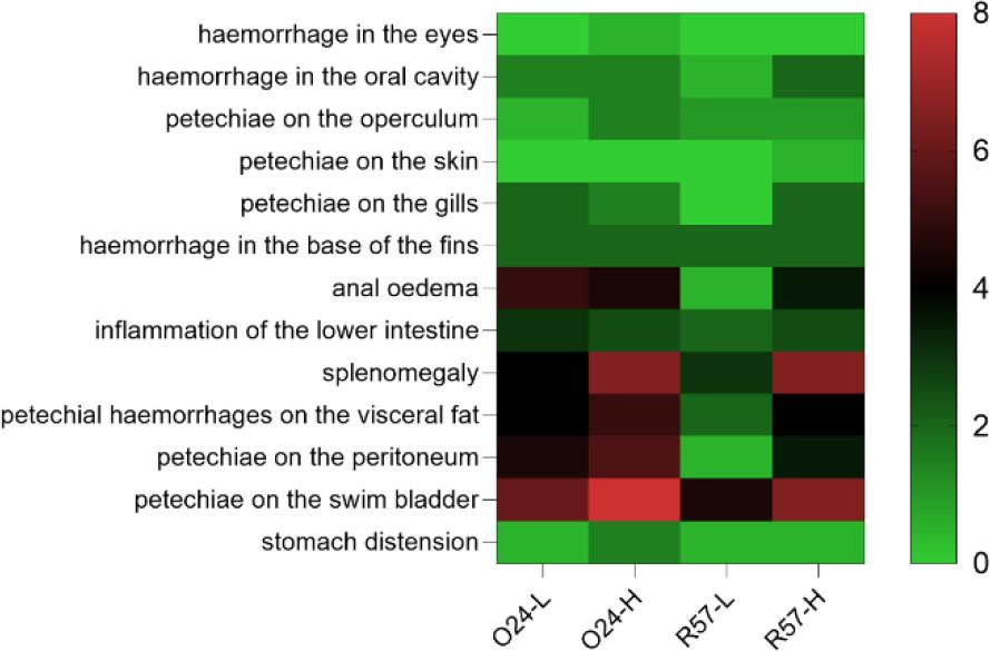 Frequency of clinical symptoms and pathological changes in rainbow trout challenged with fliC gene–repressed (024) and fliC gene–expressing (R57) Yersinia ruckeri strains. The result is the average of two repetitions. L – low infectious dose; H – high infectious dose. Colour gradient corresponds to the mean number of individuals showing clinical symptoms