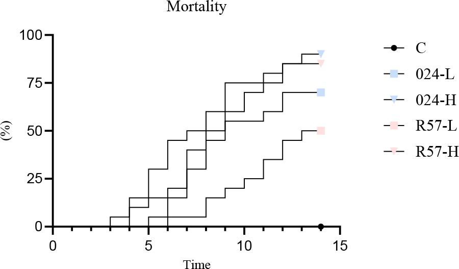Mortality of rainbow trout challenged with fliC gene–repressed (024) and fliC gene–expressing (R57) Yersinia ruckeri strains. Mortality in the negative control group lies along the X-axis. L – low infectious dose; H – high infectious dose
