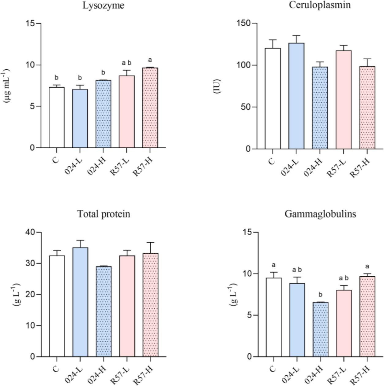 The activation extents of the innate humoral defence mechanisms in Y. ruckeri-infected rainbow trout are compared in Fig. 3. The analysis of the results revealed that lysozyme activity in the serum of rainbow trout was elevated in the R57-H group compared to the control group and both 024 groups. Ceruloplasmin activity showed no significant changes across any of the experimental groups. A similar result was observed in the total protein levels. A lower serum gammaglobulin level was noted in the 024-H group when compared to both the control group and the R57-H group.
