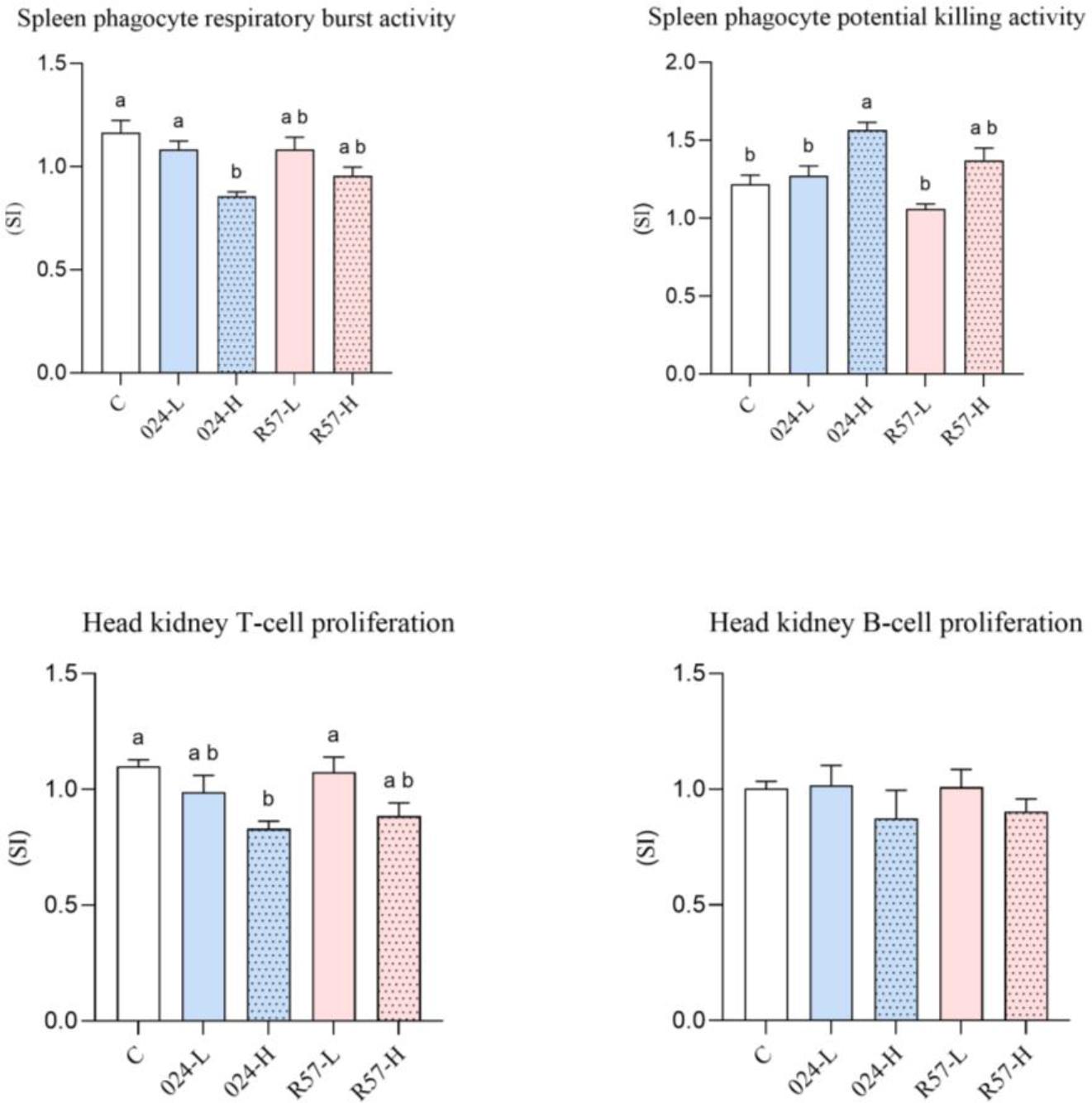 The cell-mediated immune parameters of rainbow trout challenged with fliC gene–repressed (024) and fliC gene–expressing (R57) Yersinia ruckeri strains. All data are expressed as stimulation index + standard error of the mean. Different letters indicate significant differences (P-value < 0.05), and shared or the same letters indicate no significant differences between groups