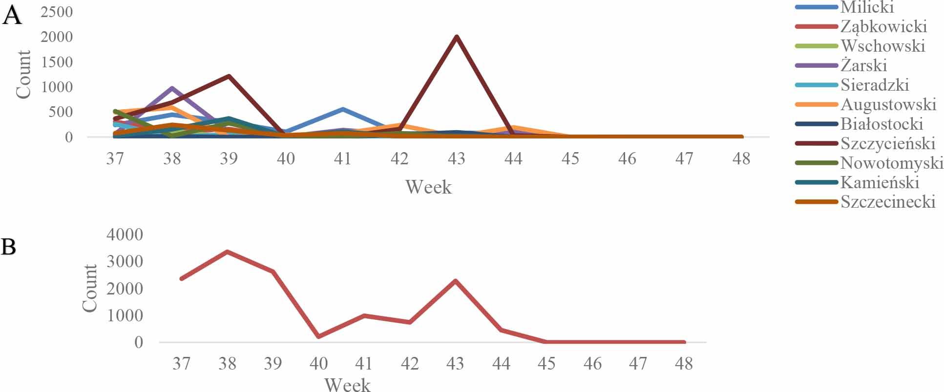 A total of 13,022 individual Culicoides females were identified in the 11 locations selected for the entomological monitoring. The number of midges collected per site ranged from 120 to 4,480. In most locations, trapping was carried out once a week from the beginning of September until the end of November. The highest activity of Culicoides was observed in the Szczycieński district (No. 8), and was characterised by two intense peaks of abundance. The Milicki (No. 1), Żarski (No. 4) and Augustowski (No. 6) districts also exhibited noticeable surges in Culicoides counts, although these were shorter in duration and less pronounced than in Szczycieński. In the remaining locations, midge abundance remained low and relatively stable throughout the observation period. Notably, midge activity across all sites ceased almost entirely after week 44, indicating a sharp seasonal decline. The dynamics of Culicoides abundance across the 11 trapping sites is presented in Fig. 2.
