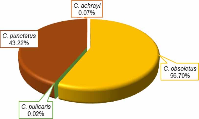 Regardless of the trapping site, the most abundant species was C. obsoletus / scoticus complex (7,383 individuals; 56.7%). Culicoides punctatus made up almost all of the remainder (5,628 individuals; 43.2%). Occasionally, C. achrayi and C. pulicaris were also recorded (Fig. 3).