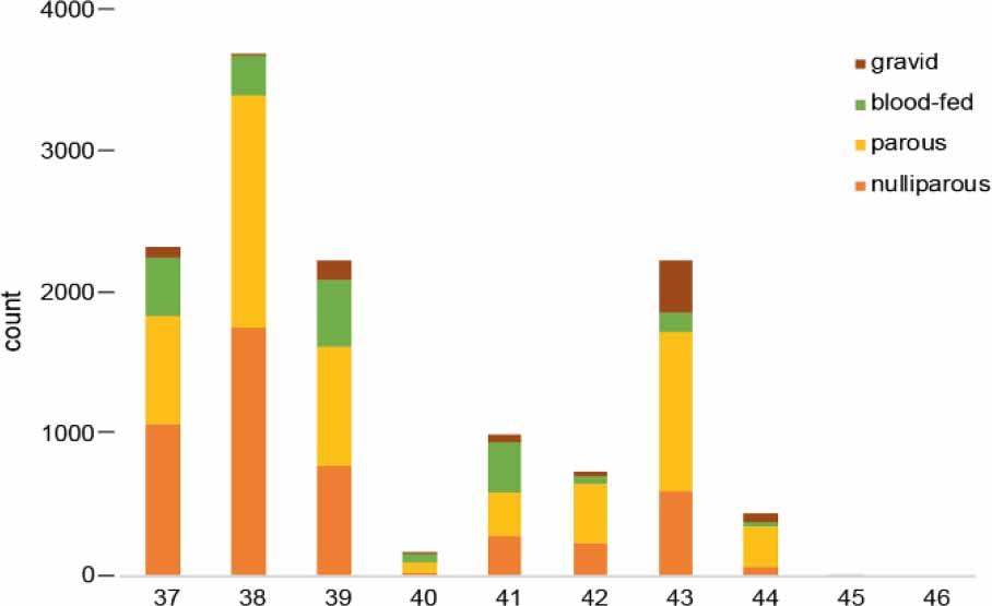 Midges were collected in all gonotrophic stages (Fig. 4): nulliparous (females prior to their first blood feeding), parous (females that have digested a blood meal and laid eggs), blood-fed (females with blood-engorged abdomens) and gravid (females carrying eggs). A total of 8,006 females exhibited evidence of prior blood feeding (classified as blood fed, parous or gravid), with blood-fed females comprising 14% of the total sample. The bar chart presents the weekly distribution of Culicoides females by gonotrophic stage from weeks 37 to 46. Two major peaks in abundance are evident – in weeks 38 and 43 – dominated by parous and nulliparous females, reflecting high reproductive activity. Gravid and blood-fed individuals appear in moderate numbers, with gravid forms peaking in week 43. After week 44, total counts decline rapidly, and by week 45, midge activity has nearly ceased, marking the end of the reproductive season.