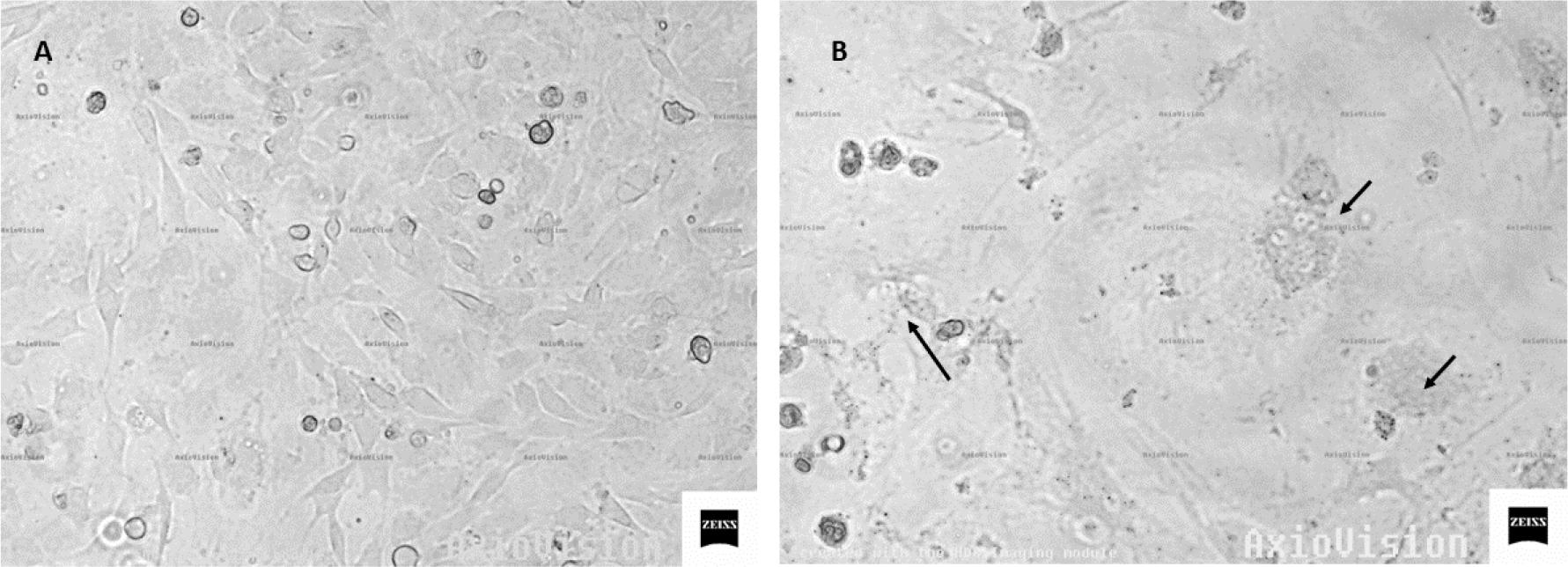Photomicrographs of skin cells: A – uninfected cells; B – cultured cells at 7 days after SRLV infection (arrows indicate syncytia)