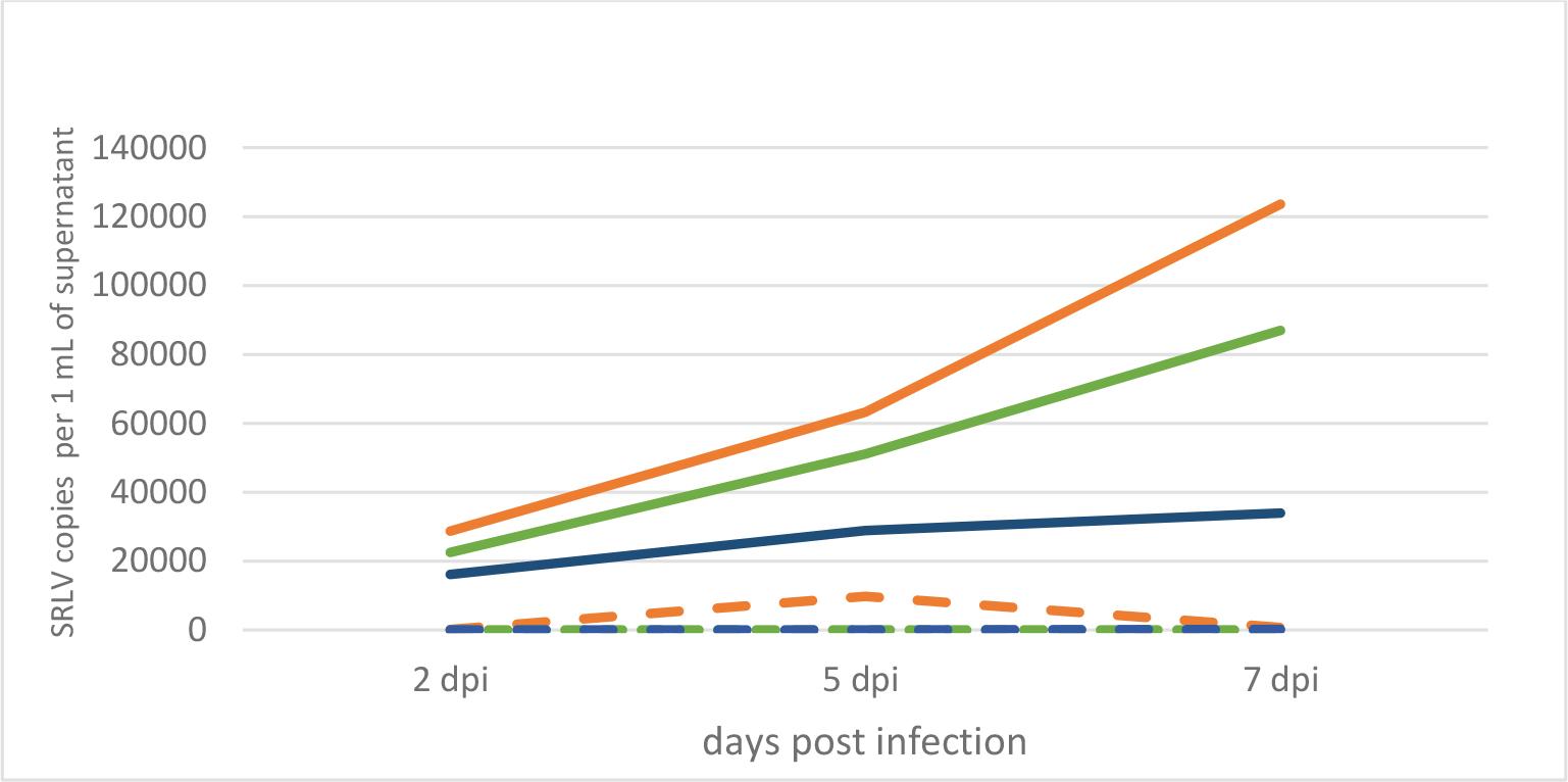 Kinetics of SRLV replication in experimentally infected skin cells from a high-proviral-load goat (solid orange line), a low-proviral-load goat (solid blue line) and an uninfected goat (solid green line) and these kinetics in cells left without experimental infection from the same goats (dashed lines)
