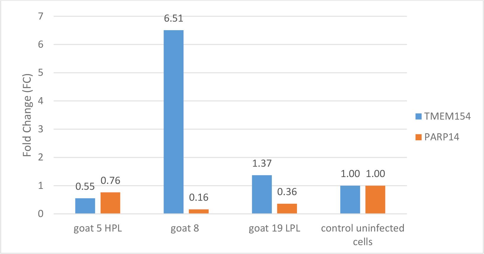 The third element examined in this study was the relative expression of the TMEM154 and PARP14 host genes in the skin cells of the three goats after SRLV infection as well as in uninfected cells. Notably, the expression of the TMEM154 gene was significantly increased (FC = 6.5) after SRLV infection in skin cells from goat No. 8, i.e. the uninfected animal, while the expression of the PARP14 gene was clearly decreased (Fig. 3). A similar trend of both genes’ expression was observed in skin cells from goat No. 19 with an LPL. Interestingly, in skin cells from goat No. 5 with an HPL, the expression of the TMEM154 gene was clearly weaker (FC = 0.55), while the expression of the PARP14 gene was only slightly lower than it was in uninfected cells (FC = 0.76).