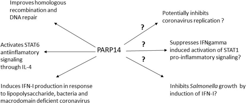 Known and probable functions of the PARP14 protein. STAT – signal transducer and activator of transcription; IFN – interferon; IL-4 – interleukin 4