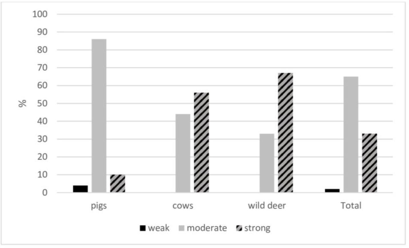 All the tested S. aureus strains showed the ability to produce biofilm (Fig. 1). Most strains (65%) were moderate biofilm producers, while only 2% had a weak biofilm production capacity. The bacteria’s ability to produce biofilm depended on the host species from which the strains were isolated: most S. aureus strains isolated from cows and wildlife were strong biofilm producers (56% and 67%, respectively), whereas most strains isolated from pigs (86%) were moderate producers.