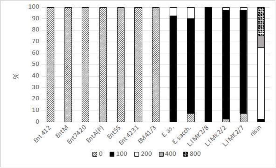 The analysis of the activity of bacteriocins against MRSA strains showed no inhibitory effect of enterocins produced by E. faecium and E. mundtii (Fig. 2). The bacteriocins produced by the other Enterococcus species (E. asini and E. saccharolyticus) exerted an inhibitory effect on the growth of the MRSA strains at the level of 100–200 AU/mL. Among the bacteriocins produced by L. lactis, nisin showed the highest inhibitory activity (100–800 AU/mL). The activity of the L. lactis bacteriocins L.l MK 2/8, L.l MK 2/2 and L.l MK 2/7 against MRSA was in the range of 100–200 AU/mL (Fig. 2).
