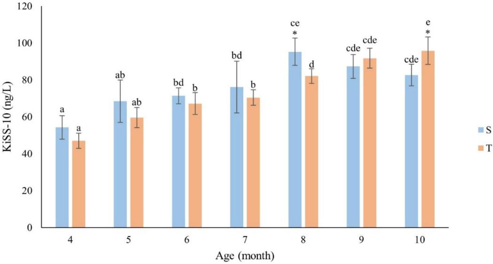 Concentration of kisspeptin-10 (KiSS-10) (ng/L) by month of life of singleton (S – n = 13) and twin (T – n = 11) ewes. The values presented in the figure are mean (±SD) concentrations in the plasma collected monthly every 15 min for 2 h. * – statistically significant difference between S and T (P-value ≤ 0.05); a, b, c, d and e – mean values in a particular month marked with different letters differ significantly (P-value ≤ 0.05)