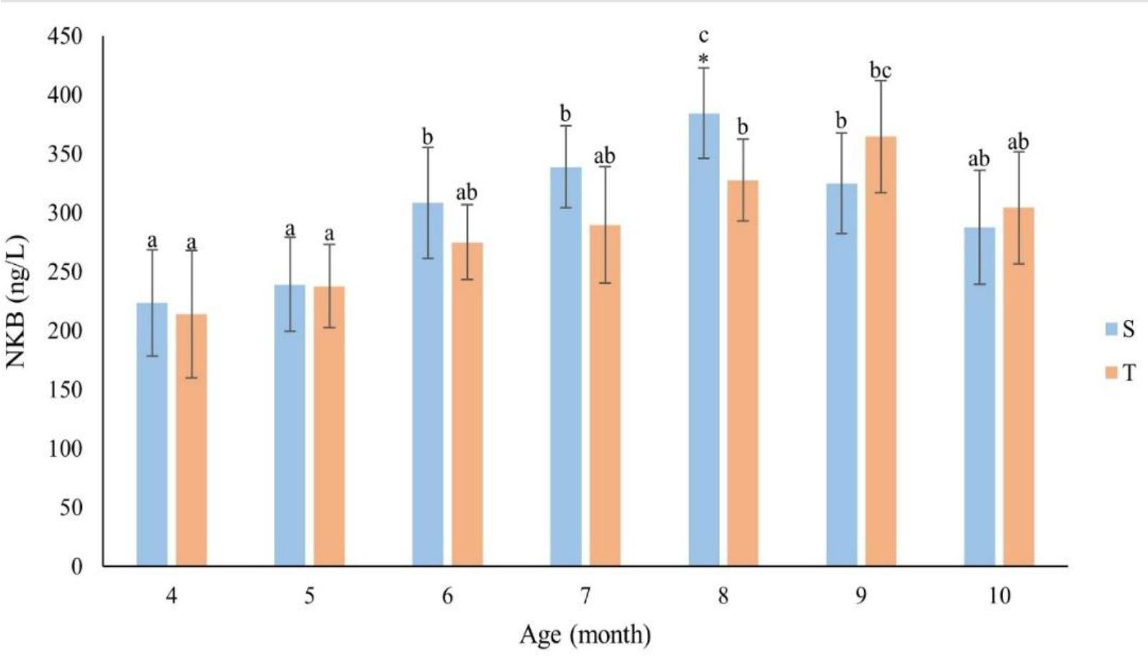 Concentration of neurokinin B (NKB) (ng/L) by month of life of singleton (S – n = 13) and twin (T – n = 11) ewes. The values presented in the figure are mean (±SD) concentrations in plasma collected monthly every 15 min for 2 h. * – statistically significant difference between S and T (P-value ≤ 0.05); a, b, c – mean values in a particular month marked with different letters differ significantly (P-value ≤ 0.05)