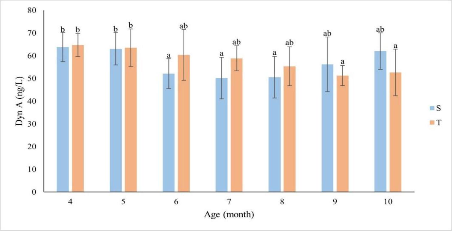Concentration of dynorphin A (Dyn A) (ng/L) by month of life of singleton (S – n = 13) and twin (T – n = 11) ewes. The values presented in the figure are mean (±SD) concentrations in the plasma collected monthly every 15 min for 2 h. a, b – mean values obtained in a particular month marked with different letters differ significantly (P-value ≤ 0.05)