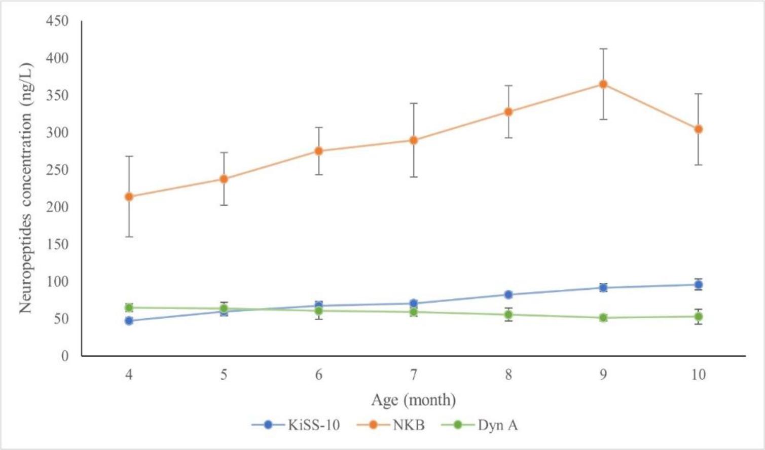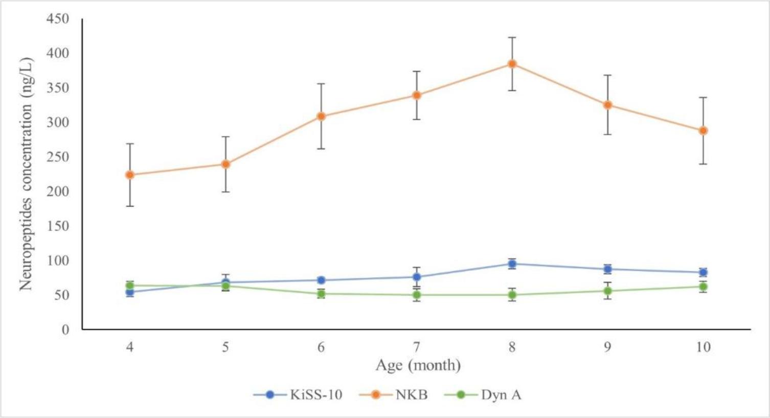 Changes in plasma kisspeptin-10 (KiSS-10), neurokinin B (NKB) and dynorphin A (Dyn A) concentrations in singleton Polish Uhruska ewes from the 4th to 10th month of life