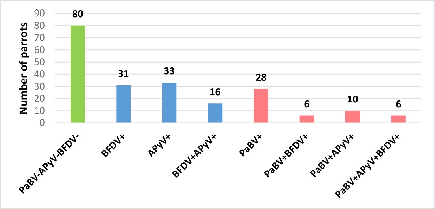Viral infections were common, with at least one of the three tested viruses (PaBV, BFDV and APyV) detected in 130 birds (61.9%) (Fig. 1). Parrot bornavirus RNA was identified in 50 parrots (23.8%), BFDV DNA in 59 parrots (28%), and APyV DNA in 65 parrots (31.0%). Mixed infections were observed in 38 birds (18.1%), among them co-infections involving PaBV were noted in 22 individuals (10.5%).