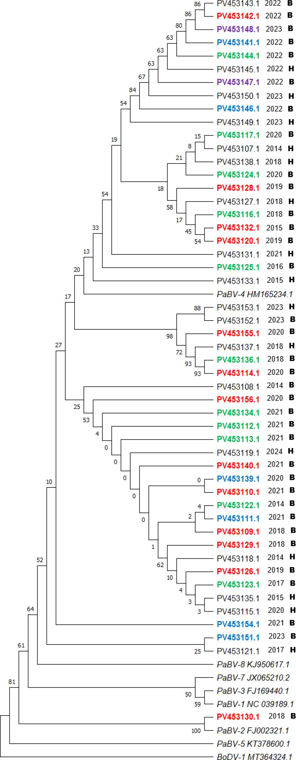 Sequencing was successful for all 50 PaBV-positive samples, and the resulting sequences were included in the phylogenetic analysis. All but one samples clustered within PaBV-4, confirming that this genotype is strongly dominant among parrots in Poland. A single sequence (PV453130.1 taken in 2018 from a breeder-aviary bird) grouped within PaBV-2, representing an isolated introduction without evidence of further spread. The results of the phylogenetic analysis are presented as a phylogenetic tree (Fig. 2).