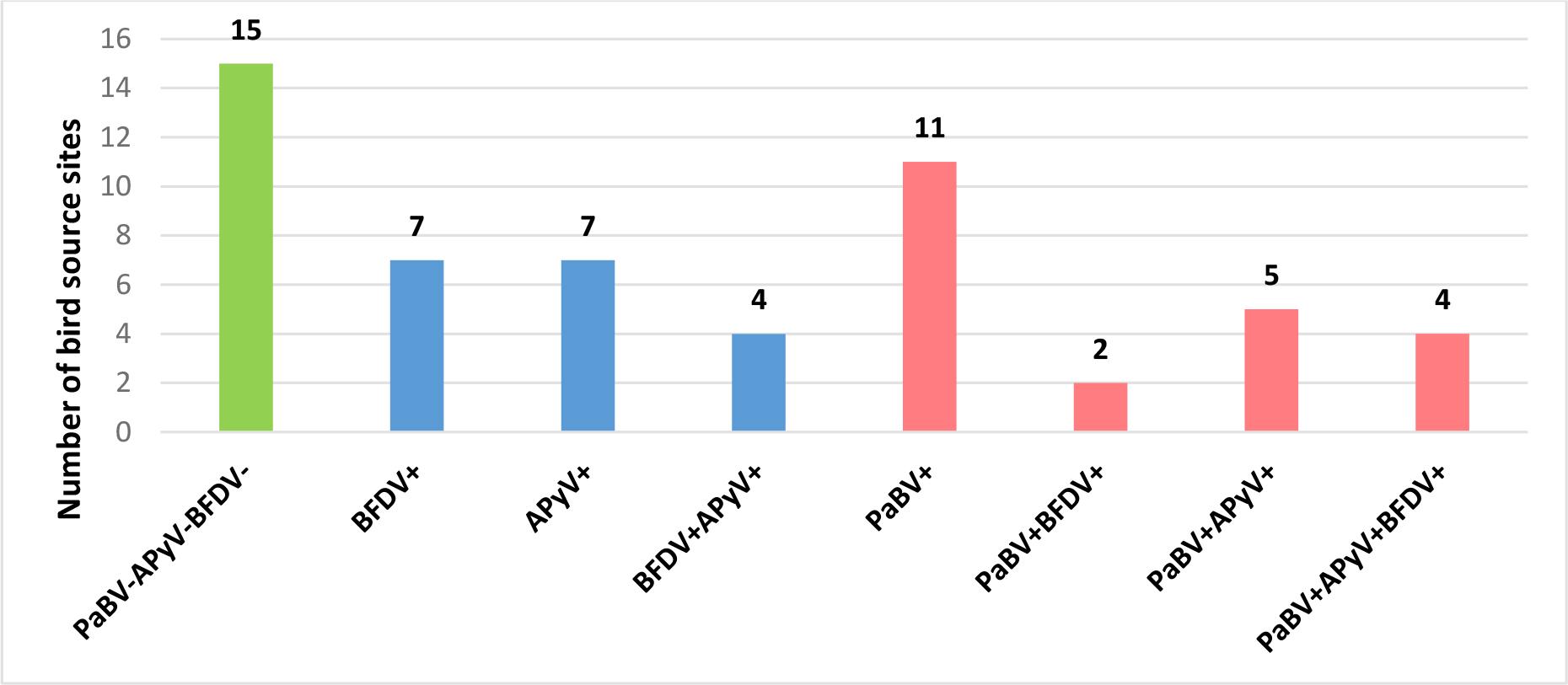Results of viral testing at the bird source–site level, showing sites free of detectable infections (green), those with single or multiple infections without PaBV (blue) and those with infections involving PaBV (pink). PaBV – psittacine bornavirus; BFDV – beak and feather disease virus; APyV – avian polyomavirus