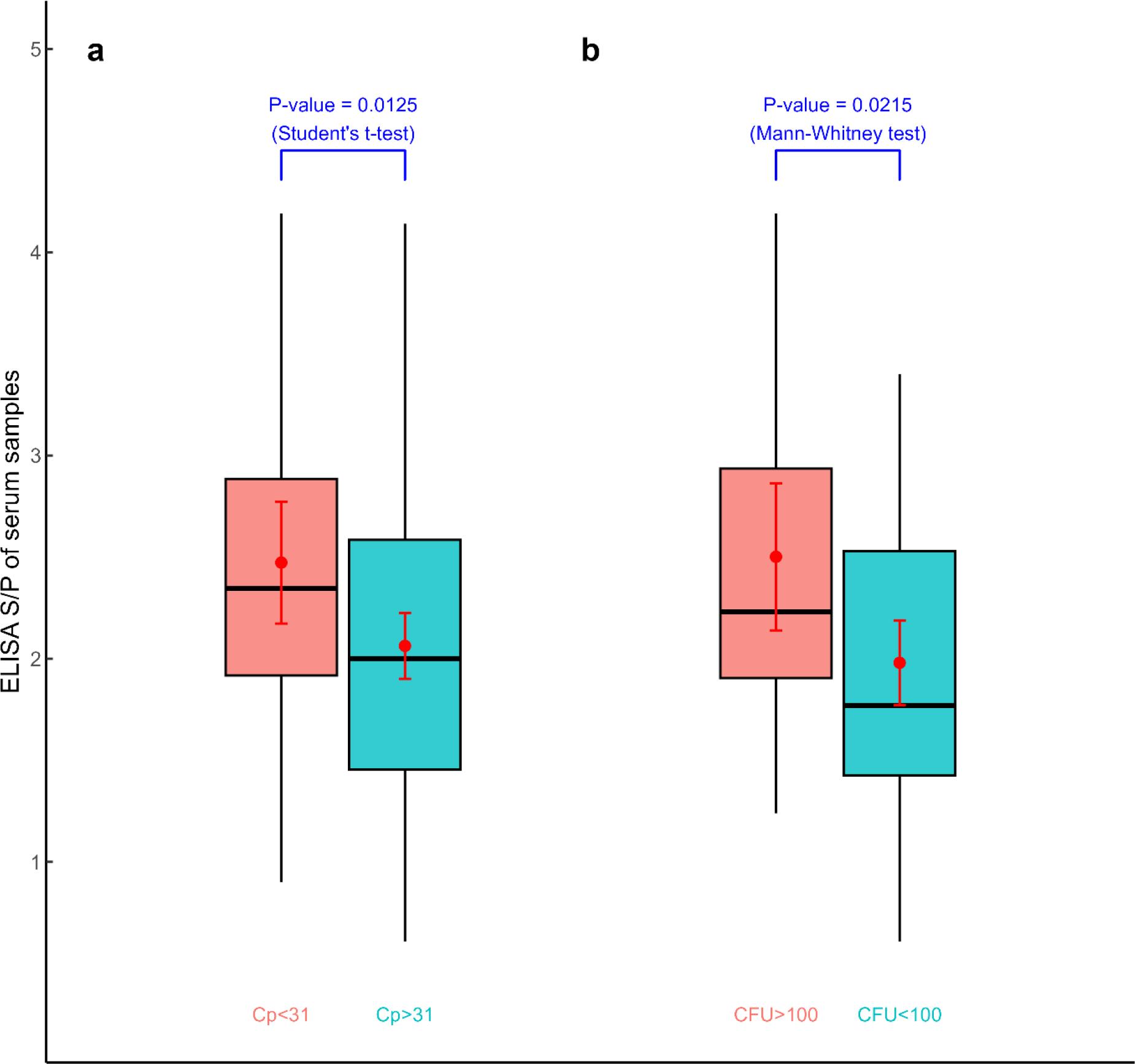 Results of Mann–Whitney U test for the significance of differences between sample-to-positive ratios (S/P) in ELISA and crossing points (Cp) from qPCR of samples with lower (CFU < 100) and higher (CFU ≥ 100) Mycobacterium avium subsp_ paratuberculosis faecal shedding