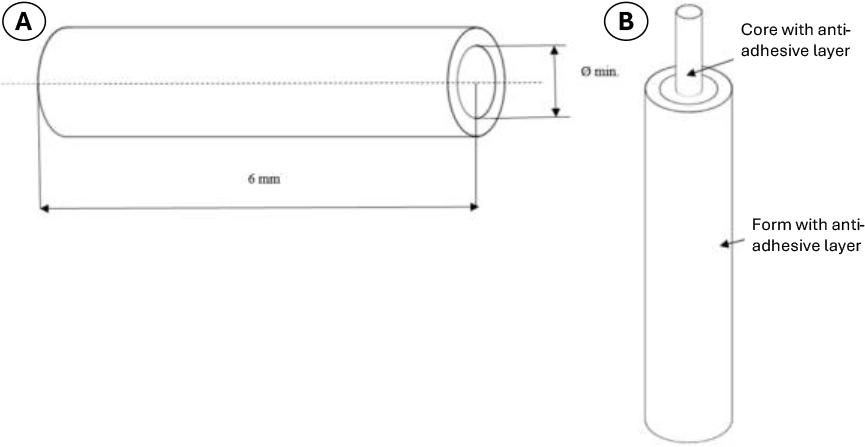 A 3-mm-diameter aluminium rod coated with Teflon provided the core in the developed hydrogel implant manufacturing technology. Its anti-adhesive properties did not interfere with the hydrogel implant dimensions and allowed easy removal. The shape-stabilising form for the tube was made of Teflon foil and had a diameter of 5 mm. The Teflon foil and Teflon-coated aluminium rod constituted the mould for casting the crosslinking solution of chemically purified gelatine and glutaraldehyde. After the material was sufficiently gelled, indicated by a colour change to orange, the external Teflon foil tube was removed. The manufactured tube with the core still inside was placed in 99.8% ethyl alcohol for an hour to increase strength, and then the core was smoothly removed to avoid altering the dimensions of the obtained hydrogel tube.