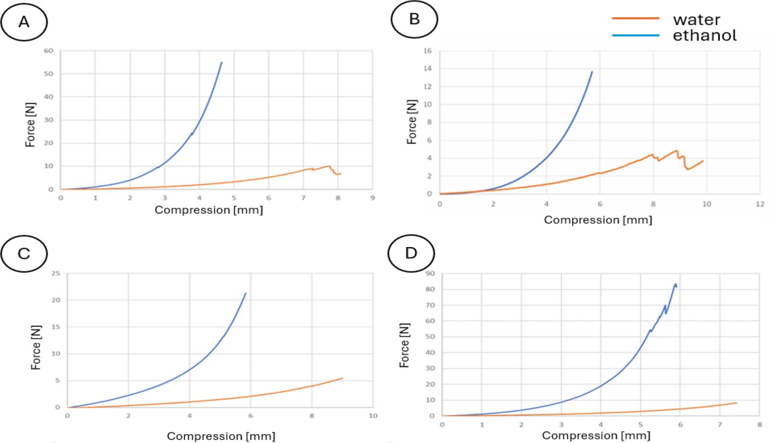 Effect of immersion environment on the compressive strength of all types of hydrogel samples. A – sample No. 1 with a glutaraldehyde concentration of 15% and the addition of 19 mL of glutaraldehyde; B – sample No. 2 with a glutaraldehyde concentration of 15% and the addition of 21 mL of glutaraldehyde; C – sample No. 3 with a glutaraldehyde concentration of 16% and the addition of 20 mL of glutaraldehyde; D – sample No. 4 with a concentration of 15% and the addition of 20 mL of glutaraldehyde. Blue line – sample immersed in ethanol; orange line – sample immersed in water