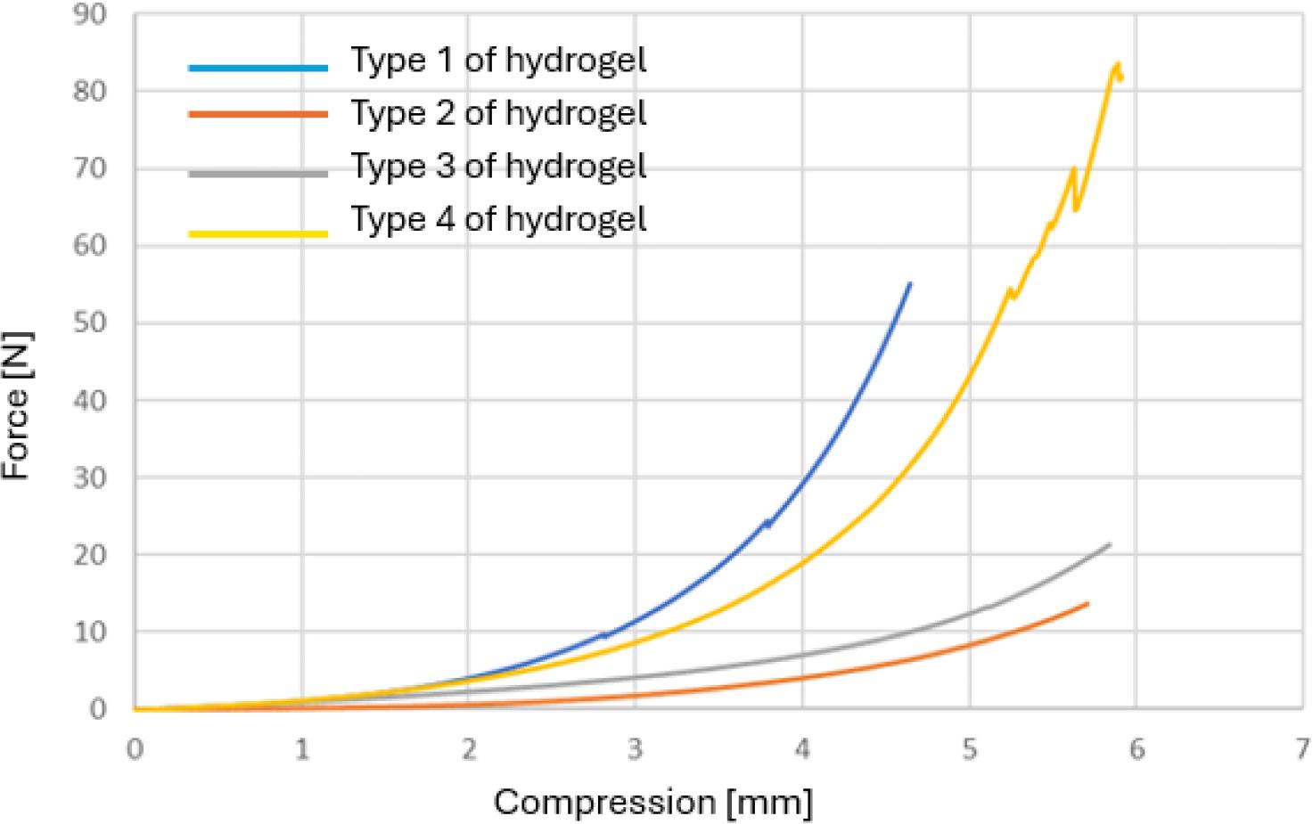 Comparison of compressive strength for different hydrogel formulations immersed in 99.8% ethanol. Type 1 – hydrogel of 15% gelatine concentration and 19 mL glutaraldehyde; Type 2 – hydrogel of 15% gelatine concentration and 21 mL glutaraldehyde; Type 3 – hydrogel of 16% gelatine concentration and 19 mL glutaraldehyde; Type 4 – hydrogel of 15% gelatine concentration and 20 mL glutaraldehyde