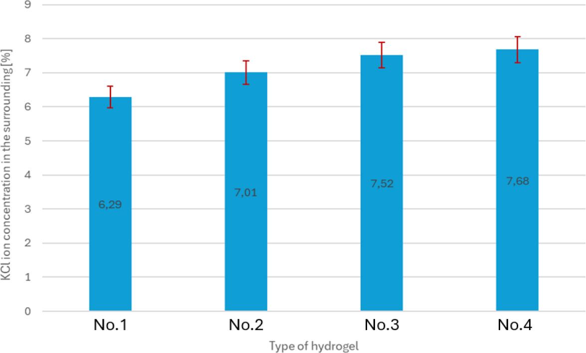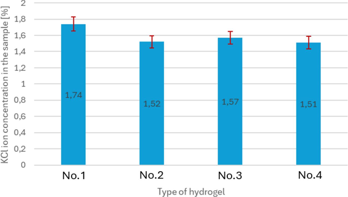 Comparison of KCl ion concentrations in the containers (after passing through the hydrogel) for the tested samples. No. 1 – hydrogel of 15% gelatine concentration and 19 mL glutaraldehyde; No. 2 – hydrogel of 15% gelatine concentration and 21 mL glutaraldehyde; No. 3 – hydrogel of 16% gelatine concentration and 19 mL glutaraldehyde; No. 4 – hydrogel of 15% gelatine concentration and 20 mL glutaraldehyde