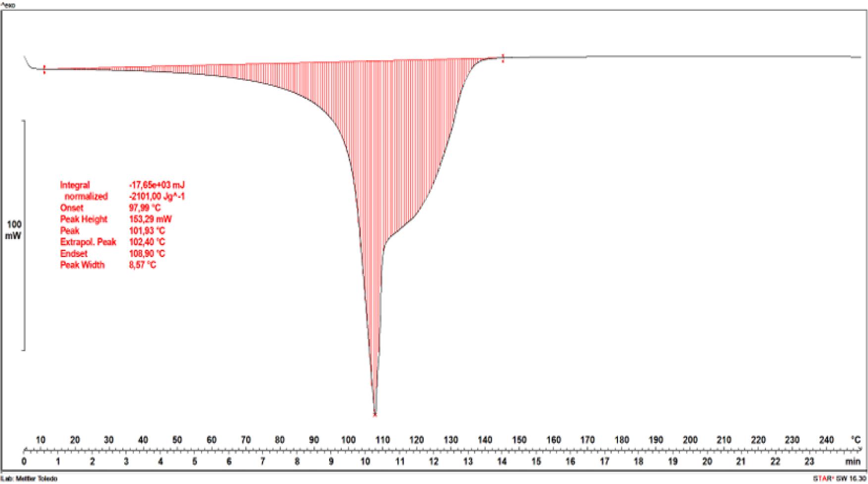 The dependencies of the heat flow rate on temperature in the studied range are exhibited for hydrogel formulation No. 1 sample immersed in water (Fig. 7) and an identical hydrogel sample immersed in 99.8% ethyl alcohol (Fig. 8). For both tested samples, characteristic thermal transformations associated with heat absorption for water evaporation contained in the hydrogels were observed. For the hydrogel sample immersed in water (Fig. 7), two endothermic transformations were distinguished. The first, at around 110°C, resulted from the evaporation of water weakly bound in the hydrogel structure, while the second occurred in the range of 115–145°C and was accompanied by the evaporation of the water most strongly bound in the structure. In the hydrogel sample cured in ethanol (Fig. 8), there were more thermal transformations associated with the evaporation of water with varying degrees of binding in the material structure. The most-weakly bound water was evaporated in two transformations at temperatures around 100°C. At a temperature of about 115°C, water more integrally built into the hydrogel network was removed from the hydrogel. The last noticeable endothermic transformation took place at about 135°C and was associated with the removal of the water most strongly bound in the hydrogel structure. For both hydrogel samples, there were no further thermal transformations in the range of 145–250°C, which meant that the material had thermal stability in this range. The value of the water evaporation energy for the hydrogel sample immersed in water amounted to 2,101 J/g (Fig. 7). In the case of the sample immersed in ethyl alcohol, this value was almost four times lower at 577.77 J/g (Fig. 8).