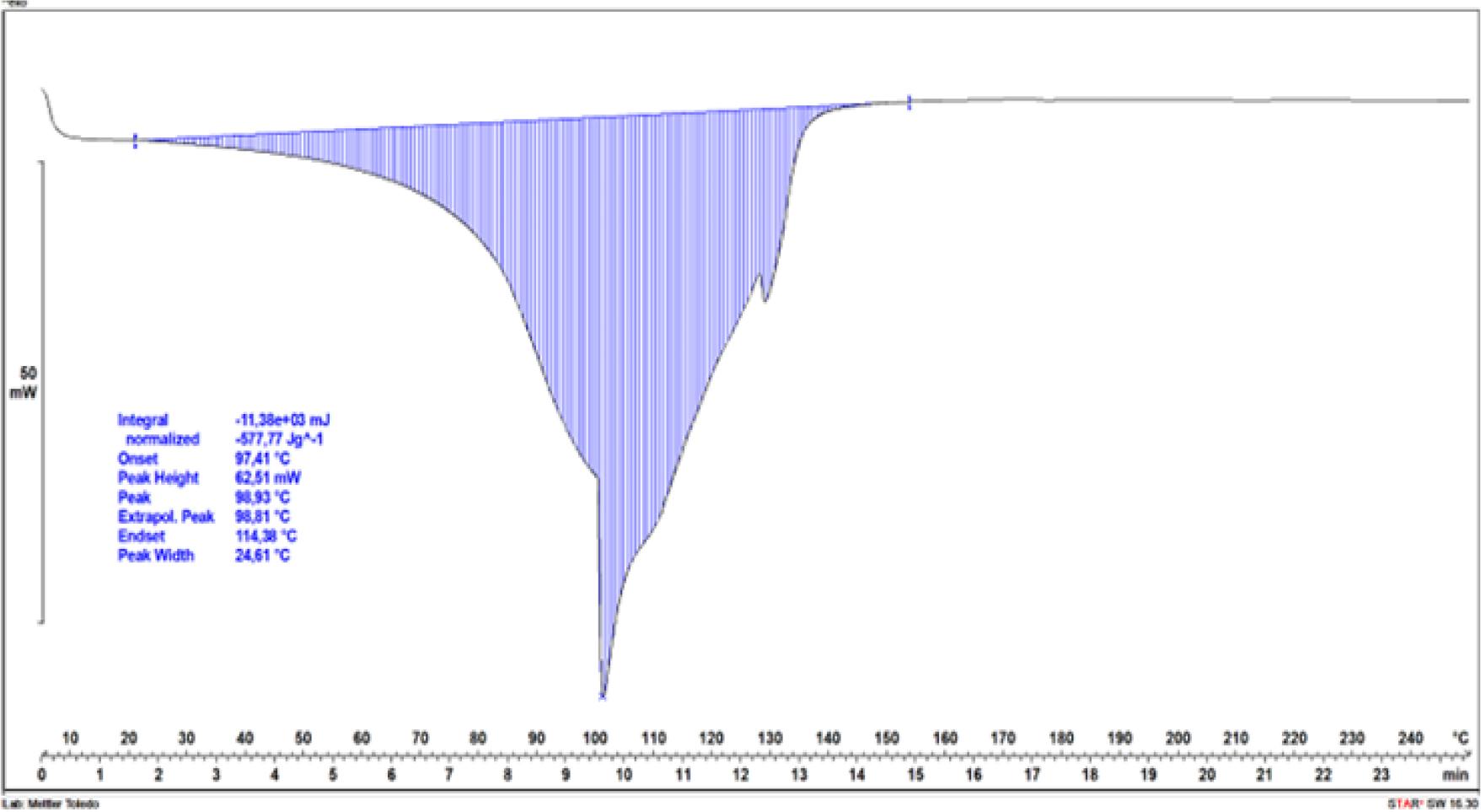 For both tested samples, characteristic thermal transformations associated with heat absorption for water evaporation contained in the hydrogels were observed. For the hydrogel sample immersed in water (Fig. 7), two endothermic transformations were distinguished.