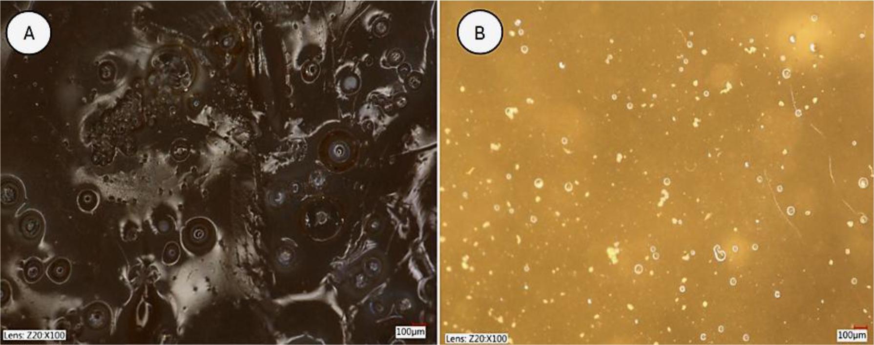 Microstructure of hydrogels at 100× magnification. A – alcohol-conditioned hydrogel; B – water-conditioned hydrogel
