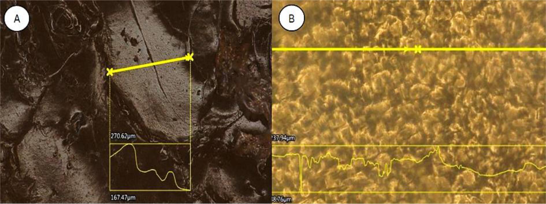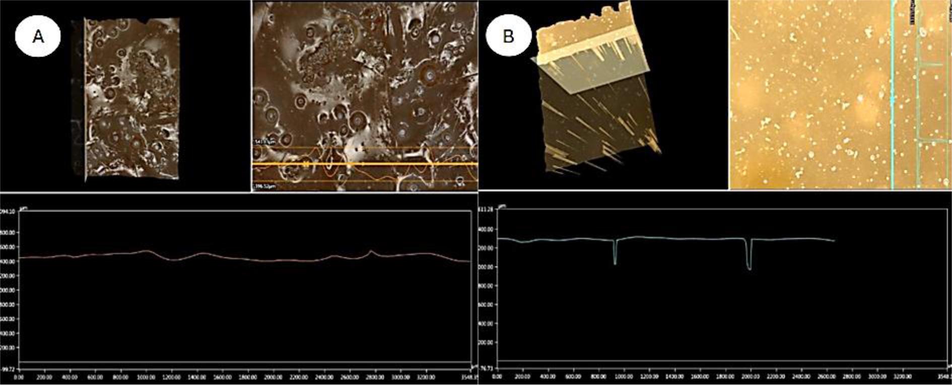 3D analysis proceeding from 100× magnification of pore distribution in hydrogel samples. A – alcohol-conditioned hydrogel; B – water-conditioned hydrogel