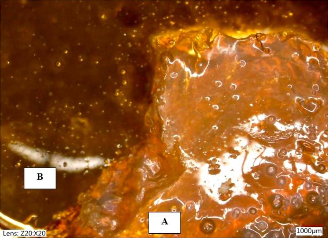 Comparison of microstructure of samples at 20× magnification A – alcohol-conditioned hydrogel; B – water-conditioned hydrogel