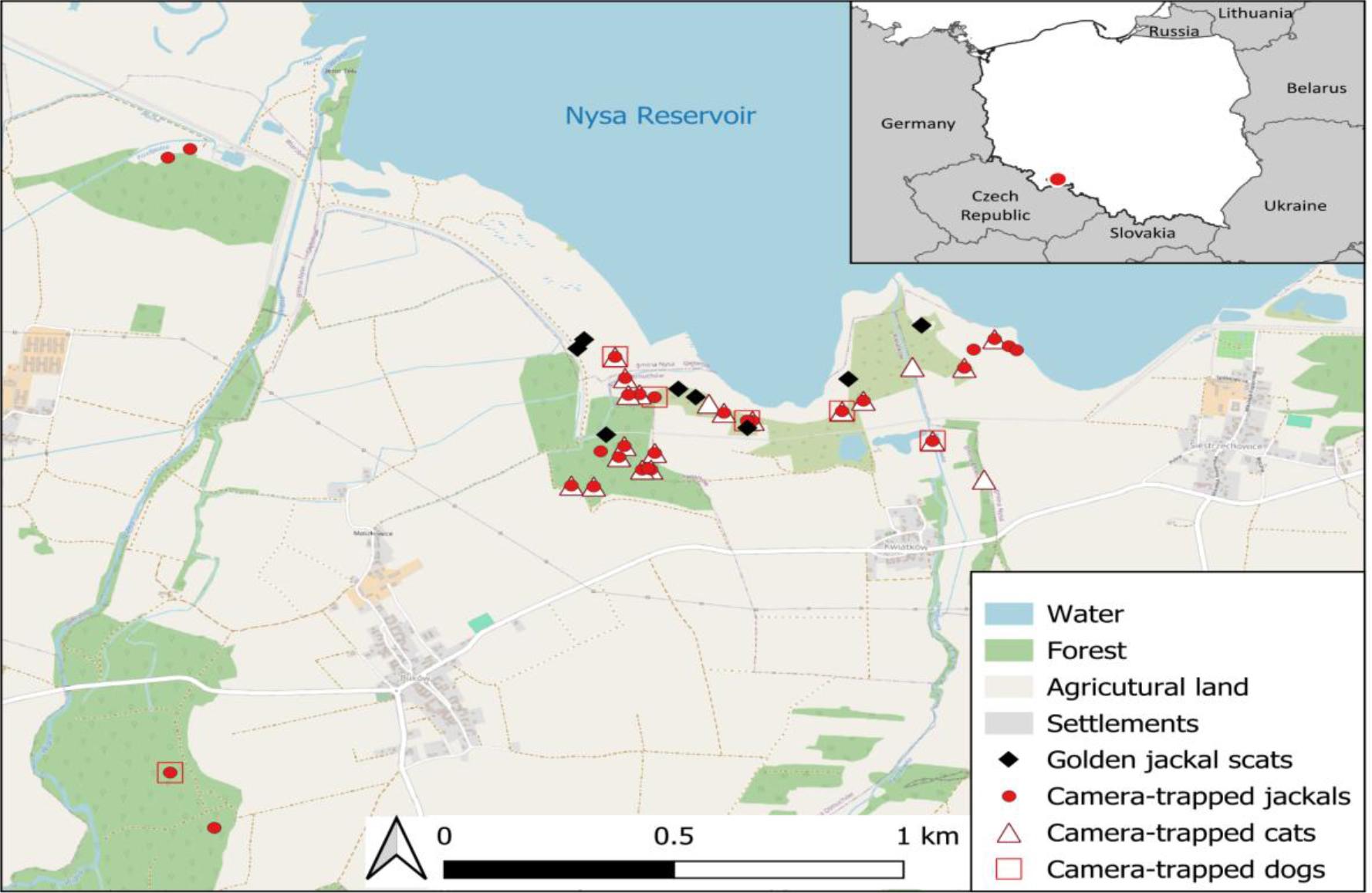 The present study was conducted in southern Poland, south of the Nysa Reservoir, in Otmuchów municipality (17.23°E, 50.44°N) (Fig. 1). The study area encompassed 15 km2, with habitats ranging from seasonally flooded shrubby marshes to patches of deciduous woodlands and open agricultural areas. Apart from the golden jackal, the mesocarnivore community in the area also consists of the red fox (Vulpes vulpes), European badger (Meles meles), Eurasian otter (Lutra lutra) and raccoon dog (Nyctereutes procyonoides).