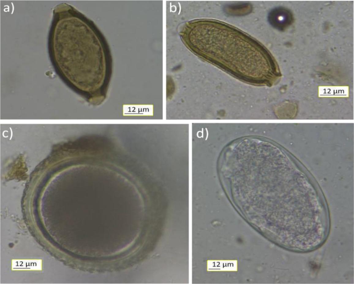 Parasite eggs found in Polish golden jackal faeces: a) Trichuris sp.; b) Capillariidae family; c) Toxocara sp.; d) Ancylostomatidae family. Magnification 400×