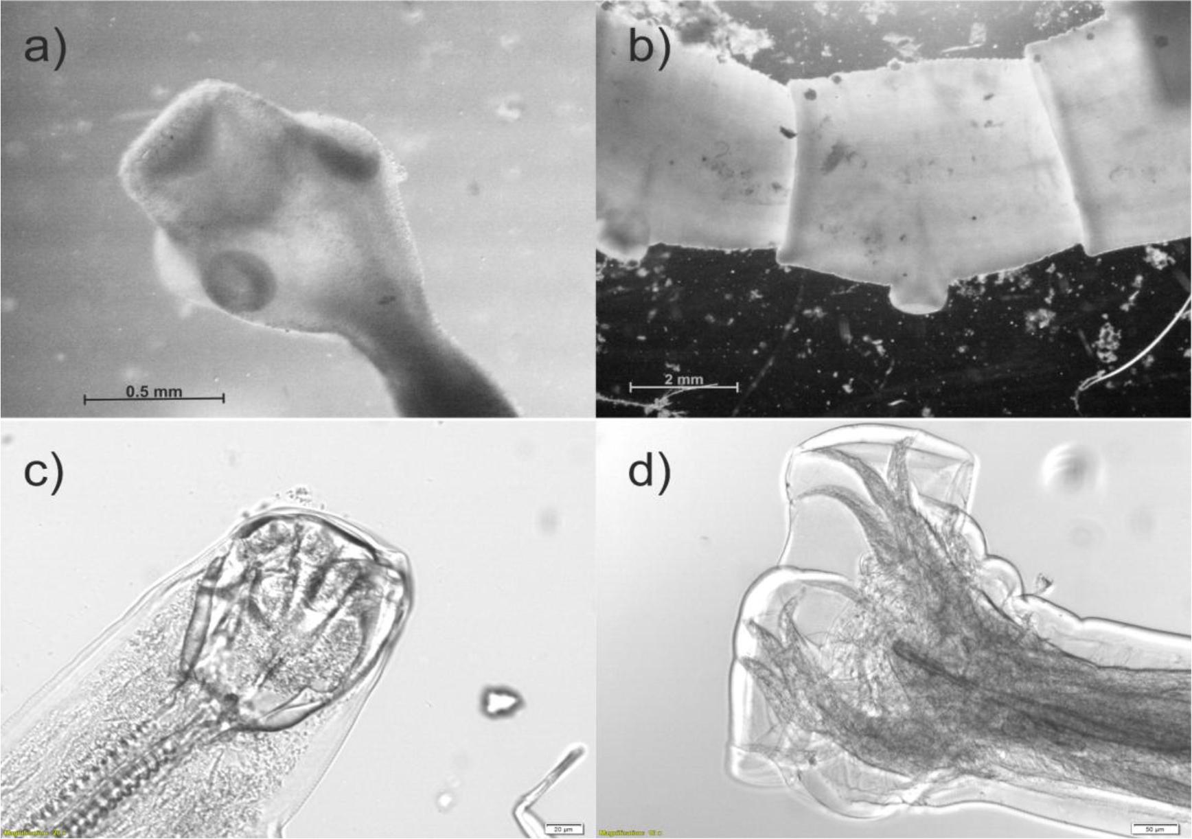 Helminths found in the intestine of a Polish golden jackal: a) Taenia serialis scolex and b) strobila, c) male Uncinaria sp. anterior extremity and d) posterior extremity