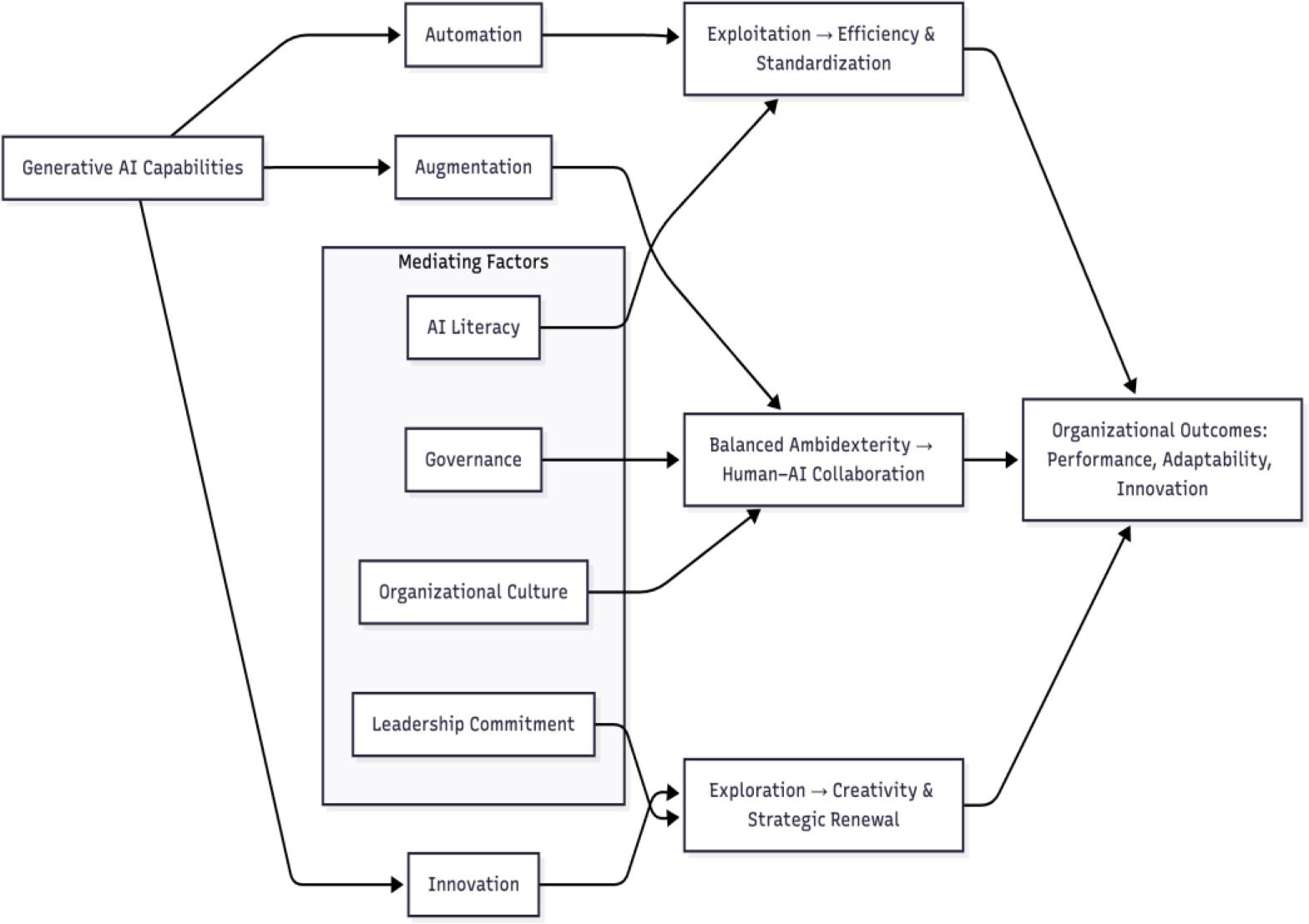 Organizational ambidexterity refers to an organization’s ability to simultaneously pursue exploitation—refining and optimizing existing competencies—and exploration— experimenting with new knowledge, ideas, and opportunities (O’Reilly & Tushman, 2013). Within the contemporary digital and knowledge economies, this balance has become increasingly dependent on technology-enabled knowledge creation and dissemination (Vial, 2019). Generative AI, with its ability to automate routine tasks while stimulating creativity and innovation, embodies both exploitative and exploratory potentials. It not only accelerates productivity through automation but also empowers human ingenuity by augmenting decision-making, knowledge generation, and problem-solving capabilities (McKinsey Global Institute, 2023).