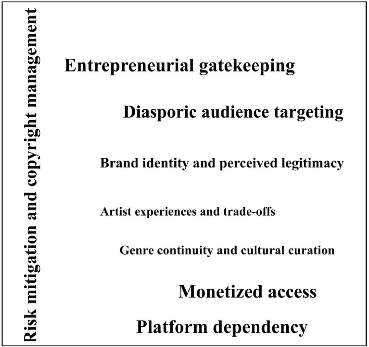 MBS act as intermediaries between artists and audiences by formatting and distributing music content across digital platforms. As Figure 2 illustrates, although they enable access, their gatekeeping role is shaped by financial entry points and platform dependency, especially on services like YouTube. The findings of this study are organized around five interrelated themes that emerged from interviews, platform analysis, and media sources: (1) Entrepreneurial Curation and Monetized Access; (2) Platform Dependency and Risk Management; (3) Strategic Artist Engagement and Diaspora Reach; (4) MBS as Sites of Reintermediation; and (5) Cultural Legitimacy and Regional Brand Identity.