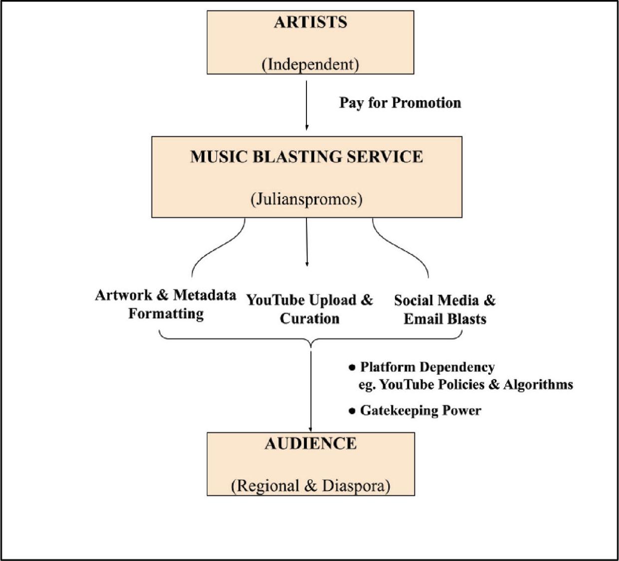 Gatekeeping theory helps illuminate the structural implications of Music Blasting Services (MBS) like Julianspromos. Traditionally, gatekeepers such as radio DJs and festival programmers filtered content based on taste, relationships, and perceived marketability. In the digital context, these filters remain—however, they are now tethered to economic access rather than editorial discretion. Julianspromos selects songs for blasting based on genre alignment and network ties, as well as whether the artist can afford the service. This introduces a form of economic stratification, where visibility becomes a function of financial capacity. While this model appears to democratize access by allowing any artist to pay for promotion, it subtly reproduces the inequalities of the past by making exposure a commodity. As Shoemaker and Vos (2009) note, gatekeeping is not eliminated in the digital era; it is diffused across new actors. In this case, MBS become entrepreneurial gatekeepers who wield curatorial power. They decide what to amplify, when to amplify it, and how to position it in relation to the rest of the digital soundscape.