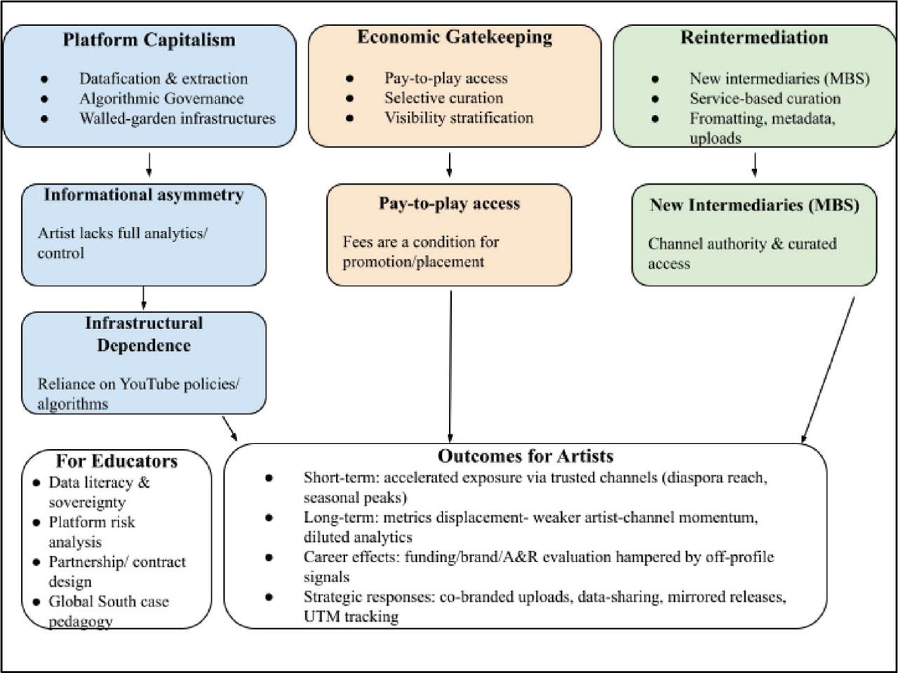 Integration of platform capitalism, economic gatekeeping, and reintermediation in the Music Blasting Service (MBS) model. Arrows indicate how informational asymmetry, infrastructural dependence, pay-to-play access, and new intermediaries interact to shape artist outcomes and educational insights.