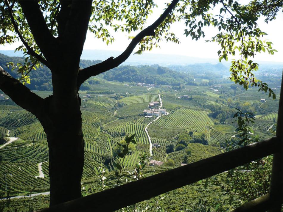 Grape cultivation is an age-old tradition in the Conegliano Valdobbiadene area that can be traced to pre-Roman times (7th century B.C.). Without a doubt, these zones offer the optimal setting for the Glera, particularly due to: a) the steep, sunny hills (that guarantee meteoric water drainage); b) the foothills of the Alps, which block cold northerly winds; c) the Venetian lagoon (50 km away), which lets in warm winds; d) a temperate climate with good summer rainfall; and e) alluvial soils. Man’s stubborn hand has succeeded in moulding a landscape, a culture, and a tradition on these steep hillslopes – an inhospitable environment for most other agricultural practices (Fig. 2).