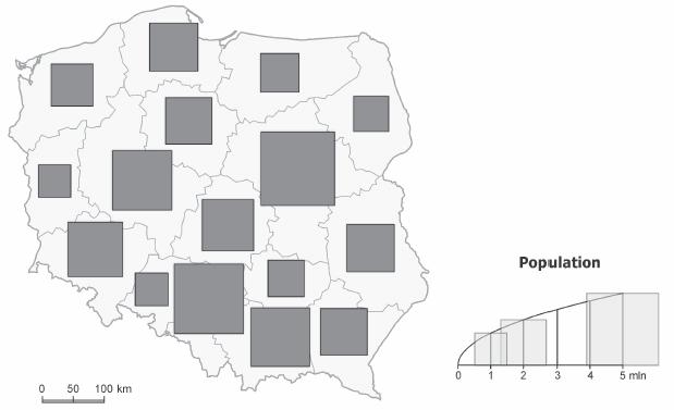 At this stage, one establishes the number of choropleth map classes, and one decides on the manner of scaling proportional symbols (linear scaling of bars, superficial scaling of circles and squares, or volumetric mathematical scaling of spheres and cubes) and their size (adjusted to map content). At this moment, the data should be adjusted to the presentation, as it may require an appropriate transformation – in other words, a change of one of the listed presentation features.