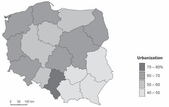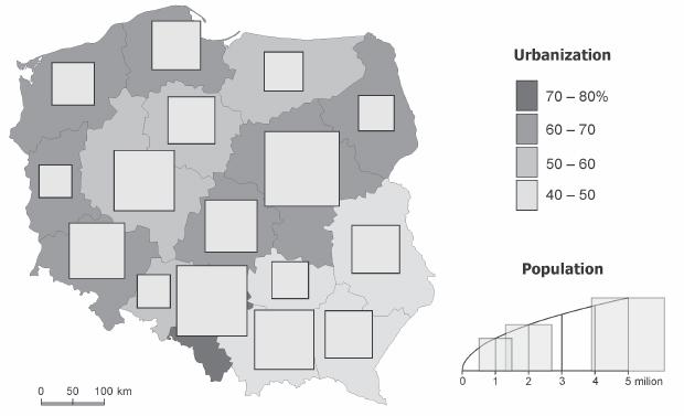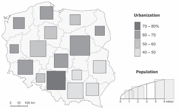 Type 1 is the simplest type of cartographic presentation (Fig. 2). It uses one simple method, and as a result of visualization one cartographic presentation form is obtained and, as a consequence, one simple map. One example of a type 1 map is that showing the population in different voivodeships (provinces in Poland) using proportional symbols, the size of which changes according to the phenomenon values (Fig. 3); another example is that showing urbanization, which is the percentage of urban population in a voivodeship’s total population, and this is presented on a choropleth map (Fig. 4). In each case there is one simple methodical procedure, which results in one simple cartographic form, and it all happens on one map.
