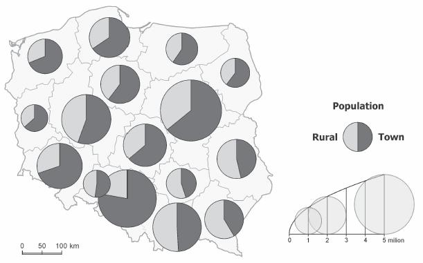 Proportional symbols presenting the size and structure of a phenomenon (Fig. 10) also constitutes a dominant method. There are two sets of data, and therefore two kinds of symbols, that have been combined in a graphic form. The sequence, however, was not random. It was necessary to calculate the size of the symbols first, and only then to calculate percentage shares of the structure elements. At the TRANSFORMATION stage, selection of data is important; the phenomena have to be strictly related (one should constitute particulars of the other, and an element of its structure).