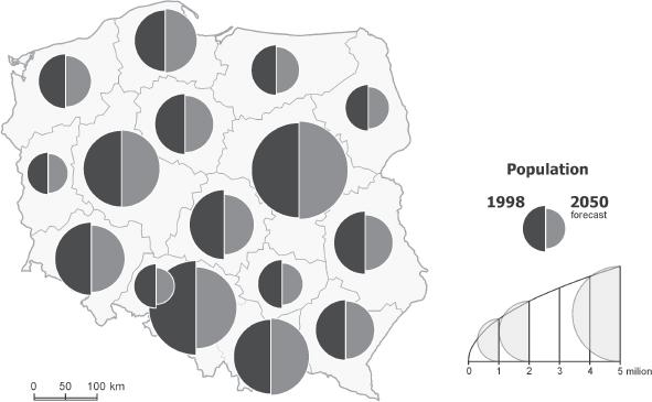 Such a presentation is supposed to allow the recipient to compare the two phenomena. The editor of the map juxtaposed diagrams in order to facilitate comparative analysis. The two methods applied are equally important. However, it should not be forgotten that at the TRANSFORMATION stage it was possible to compare two sets of data, e.g. the same phenomenon in different years or the number of males and females. Diagrams should be equally scaled. Only then can they be compared and properly read and estimated.
