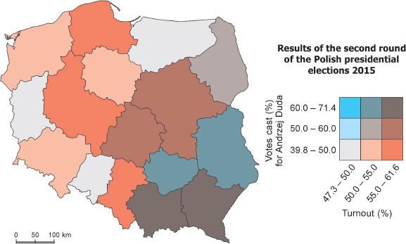 The bivariate choropleth map presented in Fig. 14 is an example. Convinced that two sets of data can be juxtaposed, the editor of the map created this combination by applying one method – a bivariate choropleth map. Combining two sets of data required the appropriate selection of classes. Graphic development was based on the complementary colors, red and cyan. The logical selection of colors is extremely important in such cases.