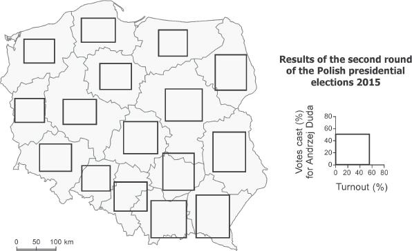 An equally complex presentation form is presented in Fig. 15. It is a bivariate map in which attributes are represented by the width and height of a rectangular diagram. Multiplying two sets of data results in a third value – another set of data (that results from the previous data). Each side of the rectangle can be interpreted separately, but it is also possible to combine them and indirectly read the third value. At the TRANSFORMATION stage two diagram scaling manners were applied.